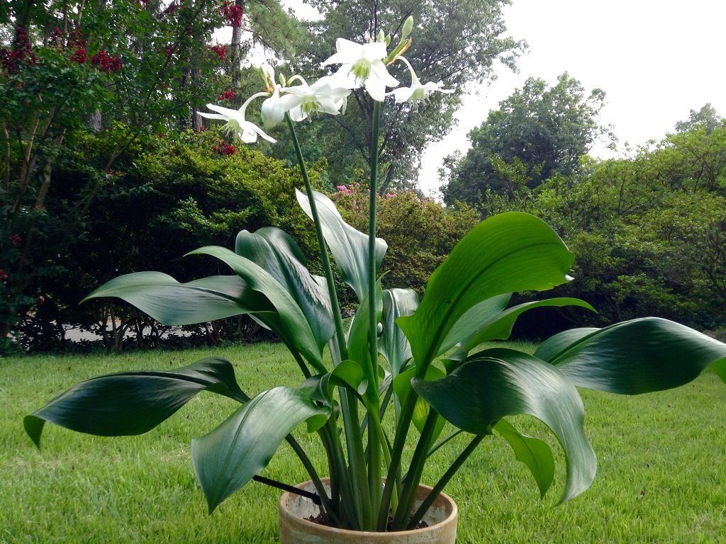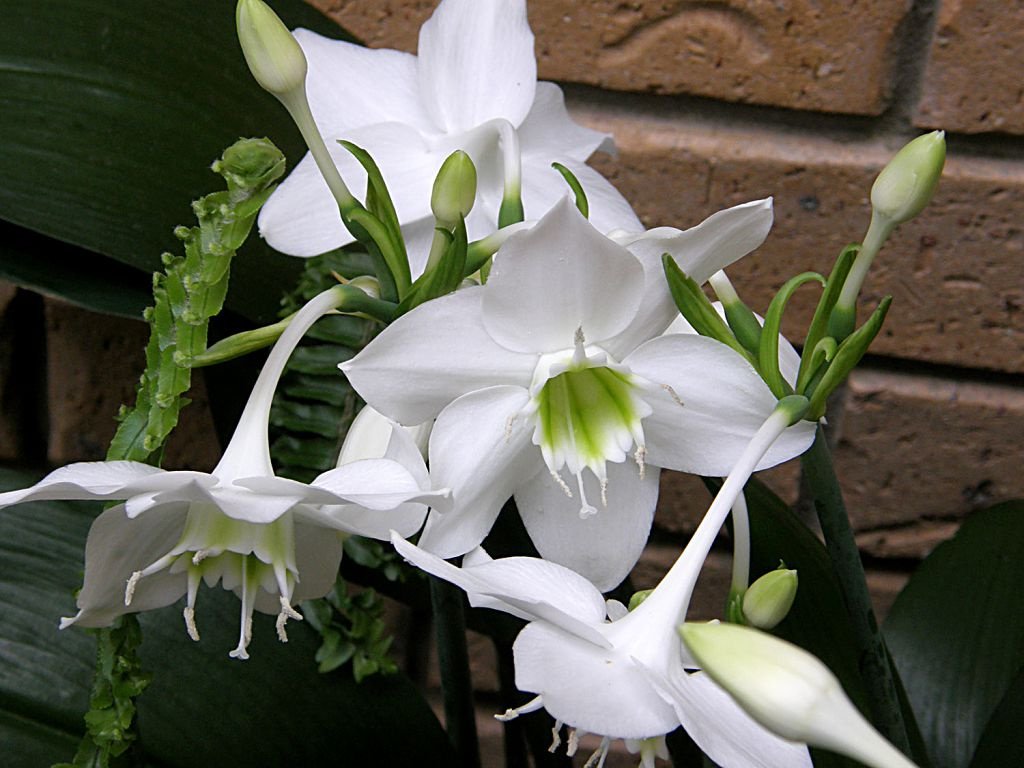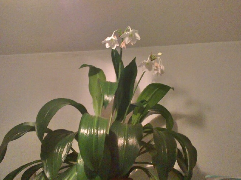 Eucharis žydi sniego baltumo gėlėmis, turinčiomis ryškų malonų aromatą.