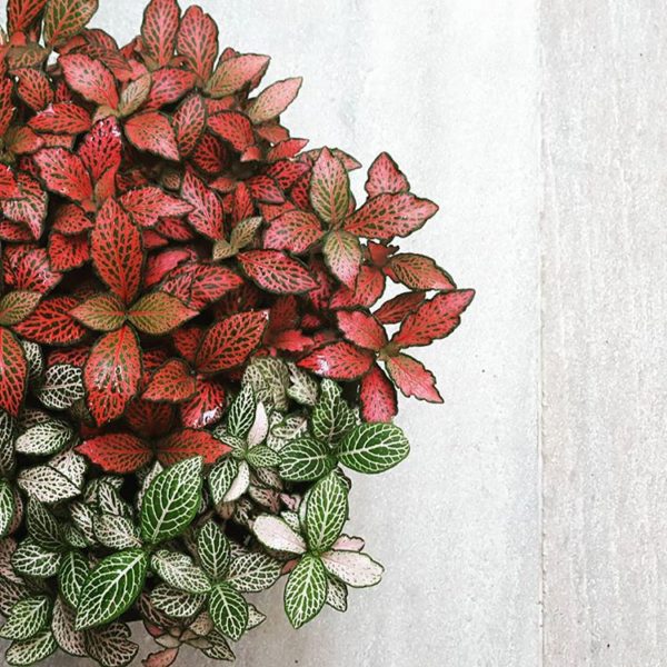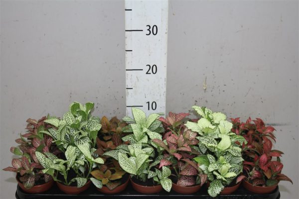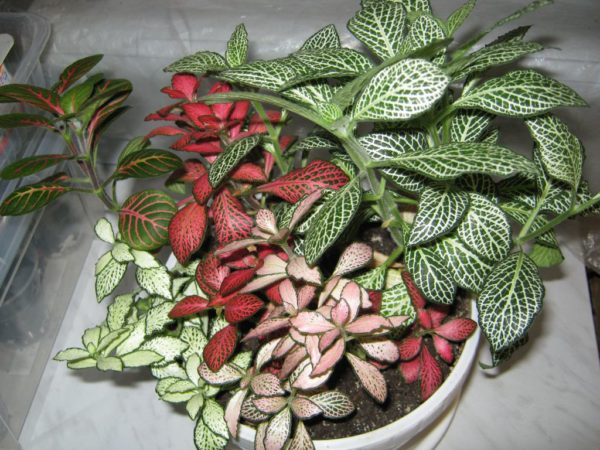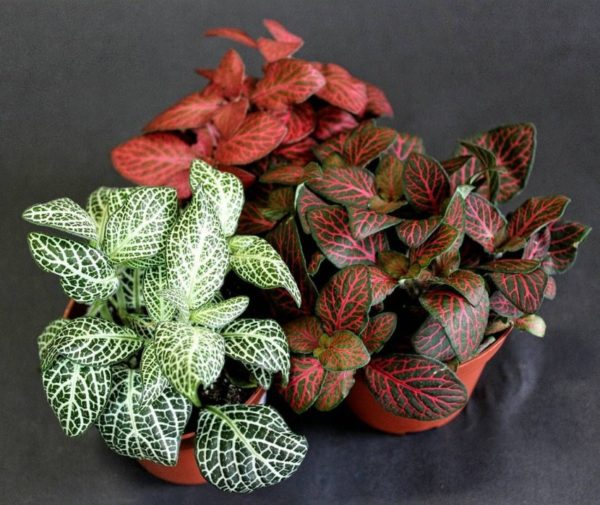 - „Fittonia Vershaffelt“. Lapai pailgi, ovalūs, žalsvai minkšti. Raudonos, rausvos ir raudonai violetinės venos sudaro sudėtingą modelį. Ūgliai gali pakeisti spalvą iš sidabro į alyvuogių. Augalas pasiekia 10 cm aukštį.