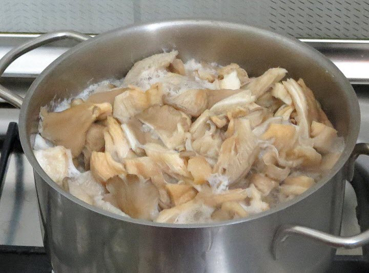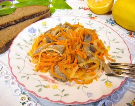 Nuimtas derlius nuvalomas nuo šiukšlių ir nuplaunamas. Kojos pašalinamos iš senų egzempliorių, o tada visi vaisiai supjaustomi juostelėmis ir virinami 15 minučių. Išvirti grybai išdedami iš keptuvės atvėsti. Tuo tarpu morkos trinamos ant trintuvės, skirtos korėjietiškoms morkoms. Atvėsę austrių grybai sumaišomi su susmulkintomis česnako skiltelėmis ir likusiu receptu.