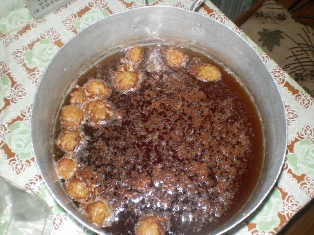 - Į keptuvę su verdančiu vandeniu įpilkite medaus porciją, gerai išmaišykite ir palikite 24 valandas stovėti tamsioje vietoje. Gautą sirupą dar kartą užvirkite ir valandą virkite ant vidutinės ugnies. Į indą įpilkite apynių, masę užvirkite ir palaikykite temperatūrą dar valandą. Visi veiksmai kartojami 4 kartus.