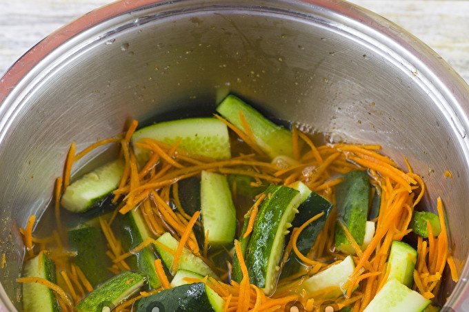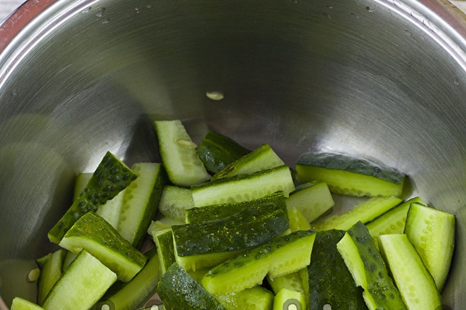 Salotas reikia ruošti dideliame stikliniame inde arba emaliuotame dubenyje. Talpykla turėtų būti pakankamai didelė, kad lengvai sumaišytų daržoves. Geriau nenaudoti aliuminio indų - jie tamsės su actu ir išskiria kenksmingas oksidacijas.Geriausias užkandis gaunamas iš jaunų stiprių agurkų. Prinokusius vaisius reikia išvalyti nuo sėklų ir patikrinti, ar nėra kartumo.