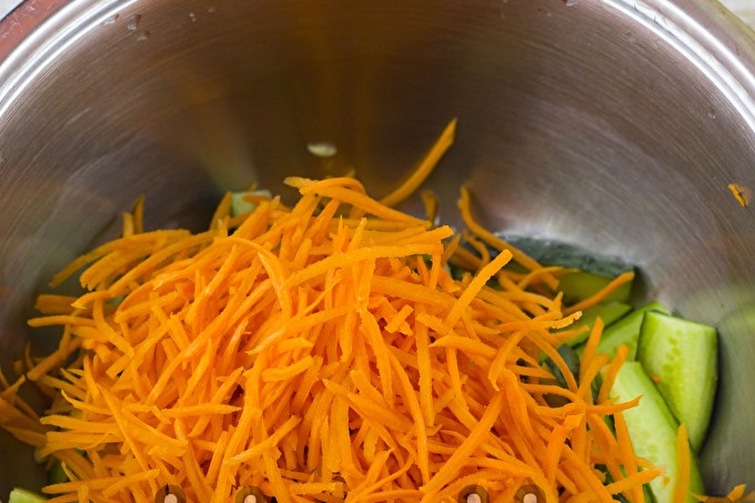 Morkas sutarkuokite morkų tarka korėjietiškomis ilgomis juostelėmis. Sudėkite į agurkus ir sukrėskite masę.
