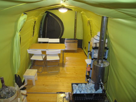 Jei nėra nieko panašaus po ranka, tai padarys lentynos iš įprastos palapinės, skirtos 4-5 žmonėms. Stalų gamybai nenaudokite medienos. Degi medžiaga neatlaiko padidėjusio drėgmės ir temperatūros šuolio.