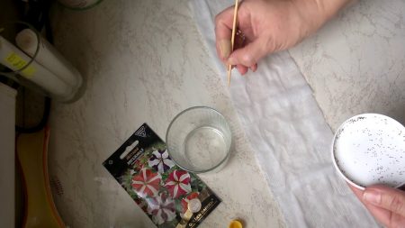 - mirkymas. Norėdami paspartinti daigumą, sėklos laikomos šiltame vandenyje (25–30 laipsnių) lėkštėje, uždengtoje marle. Kai tik sėklos sugeria drėgmę, vanduo vėl šiek tiek įpilamas. Vandens neturėtų būti per daug. Kai tik sėklos išsipučia, jos išdžiovinamos ir sėjamos;