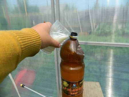 Šis viršutinis užpilas įsitvirtino kaip geras fungicidinis agentas. Pieno dėka lapų paviršius yra padengtas apsaugine plėvele, kuri neleidžia patogenams įsitvirtinti ant jų.