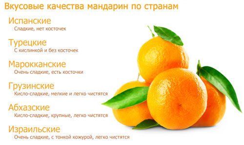 Rūšių įvairovė taip pat reiškia skonio skirtumus. Abchazijoje gimę mandarinai garsėja šviesiai apelsinų žievelėmis ir rūgščiai saldžiu skoniu. Turkijos vaisiai turi geltoną odelę ir rūgštų skonį, tačiau beveik neturi sėklų. „Ispanai“ turi odą su didelėmis poromis ir dažnai skiriasi tuo, kad joje yra žalia šakelė, saldumas ir gausu sėklų.