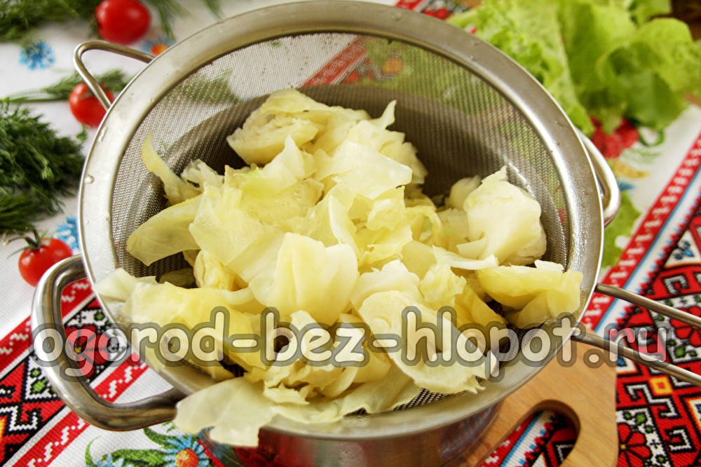 Kopūstuose pašalinkite viršutinius pažeistus lapus ir nuplaukite. Smulkiai supjaustykite kopūstus, panardinkite į verdantį pasūdytą vandenį ir užvirkite. Mesti kopūstus į kiaurasamtį.