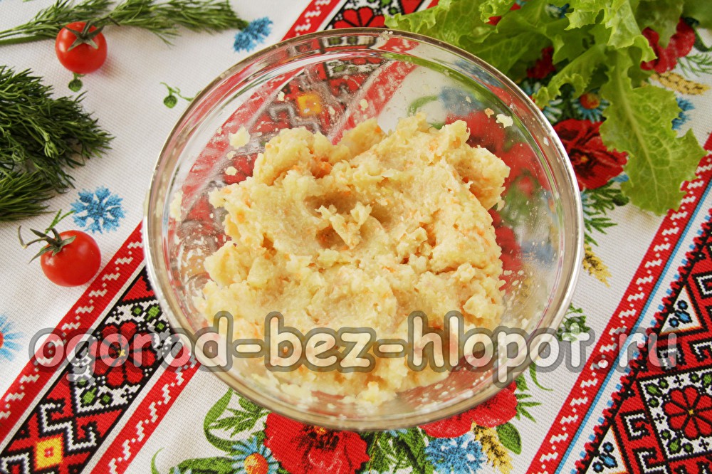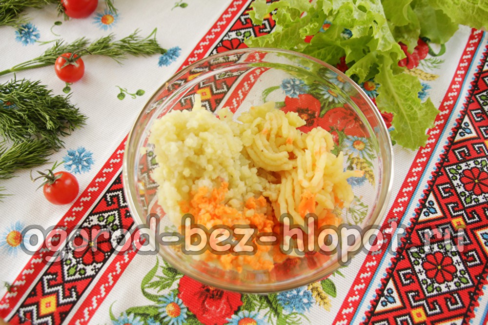 Mes nuplauname bulves ir verdame jas „pagal savo uniformą“, kol paruošta. Nulupkite bulves iš odos ir supjaustykite mažais gabalėliais, kurie pateks į mėsmalės skylę. Geriau susukti šiltas bulves per mėsmalę - bus geriau sušilti, todėl kol bulvės verda, ruošiame visus kitus ingredientus.