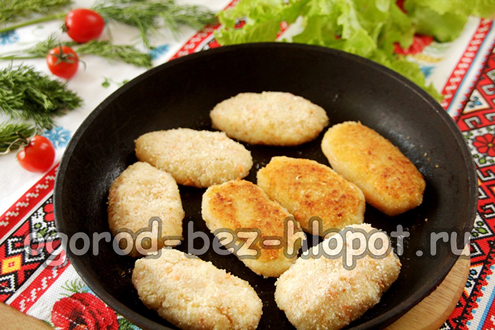 Na, pašildykite keptuvę augaliniu aliejumi. Kotletus paskleidžiame nedideliu atstumu vienas nuo kito (kad būtų patogu juos apversti) ir kepame ant ugnies šiek tiek žemiau nei vidutinės iki auksinės plutos. Tada kotletai švelniai apverčiami ir taip pat kepama kita pusė.