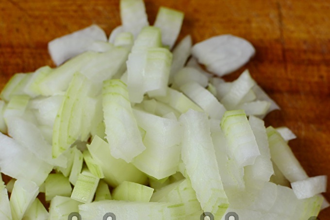 Svogūną nulupkite ir smulkiai supjaustykite.