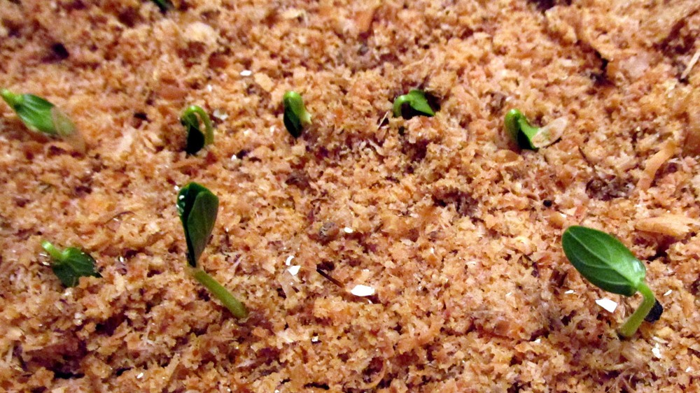 Sėklos turi būti sodinamos ne daugiau kaip 2 cm gylyje, laikantis vienodo tinklo. Dabar konteinerį galima pastatyti šiltoje vietoje ir sistemingai sudrėkinti pjuvenas, kai tik jie pradės džiūti.