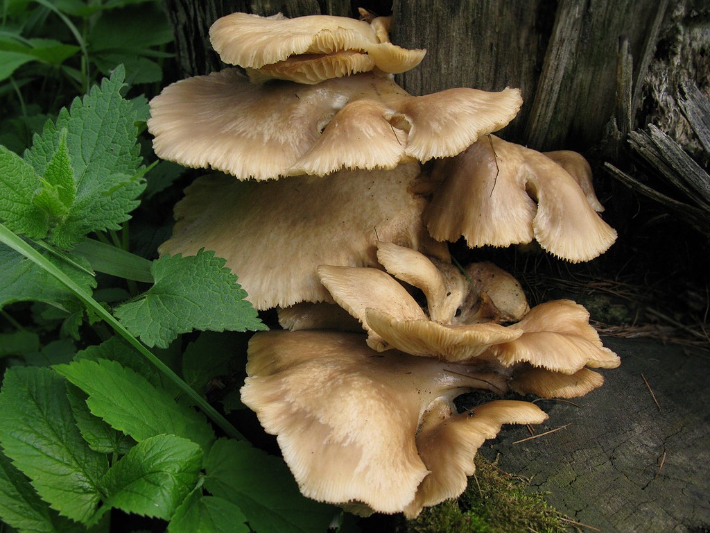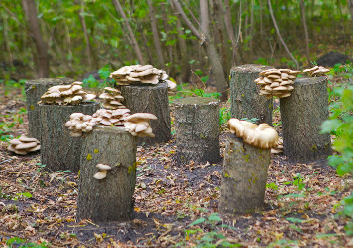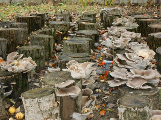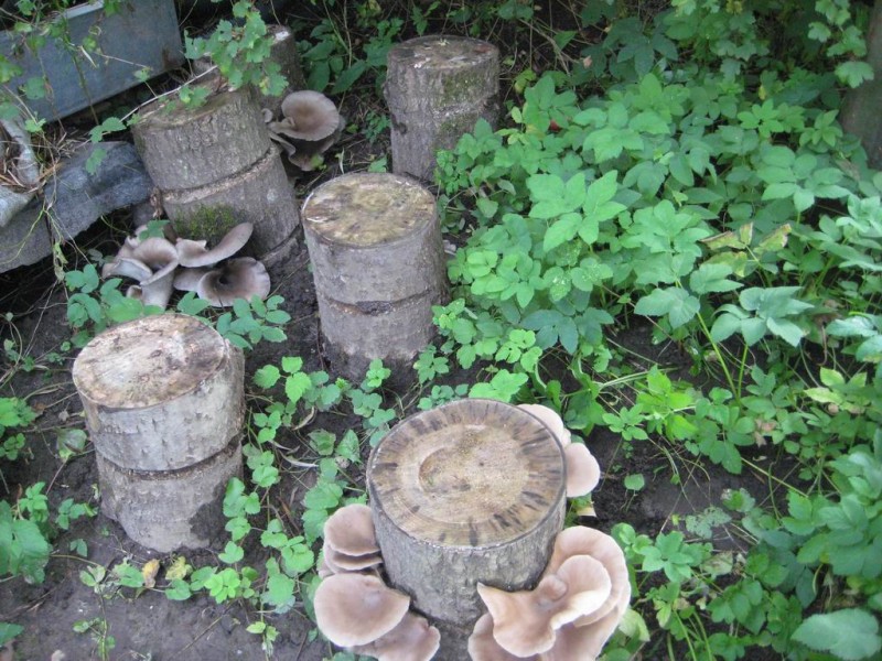 Tam tinka kieti lapuočiai: drebulė, tuopos, gluosniai, liepa. Kaip ir maišus, ant rąstų reikia atlikti gilius pjūvius ir sudėti ten nupirktą grybą. Laikykite juos pavėsyje ir vandenyje, laukdami pirmųjų grybų. Tada galite pastatyti kelmus gatvėje pavėsyje: po medžiais ar šiaurine pastato siena - ir periodiškai derlių nuimti.
