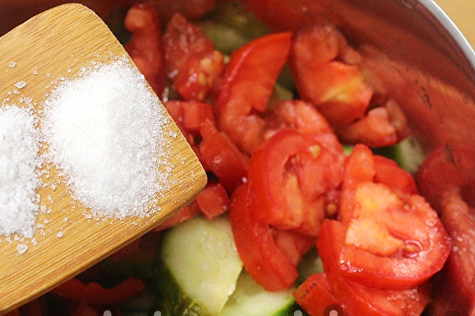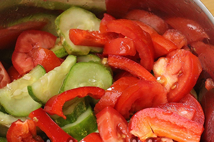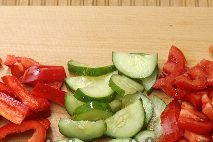 Geriausia pomidorų įvairovė šiam derliui bus „grietinėlė“ - pomidorai su tankia oda, mėsingi, ovalūs. Pomidorus perpjaukite pusiau, supjaustykite 1–1,5 cm pločio griežinėliais. Agurkus supjaustykite plonesniais, apie 0,5 cm., Pipirų kotelį supjaustykite, pašalinkite sėklas, mėsingą minkštimą supjaustykite kubeliais.