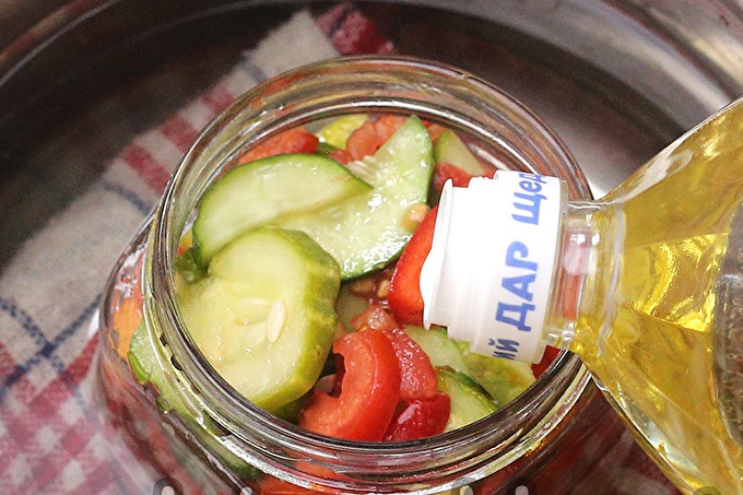 Įpilkite augalinio aliejaus (tik rafinuoto, be kvapiųjų priedų). Mes sterilizuojame dar dešimt minučių.