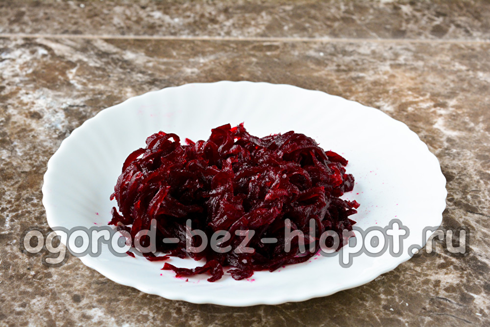 Virkite burokėlius, kol suminkštės, ir nulupkite. Kad burokėlius būtų lengviau valyti, po virimo kurį laiką užpildykite šaltu vandeniu. Atminkite, kad tokie šakniavaisiai virti 40-50 minučių, todėl nedelsdami apskaičiuokite laiką. Burokėlius patogu virti iš anksto, kad galėtumėte greitai paruošti daržovių salotas prieš vakarienę. Taigi, sutarkuokite virtus burokėlius ant įprastos rupios trintuvės.