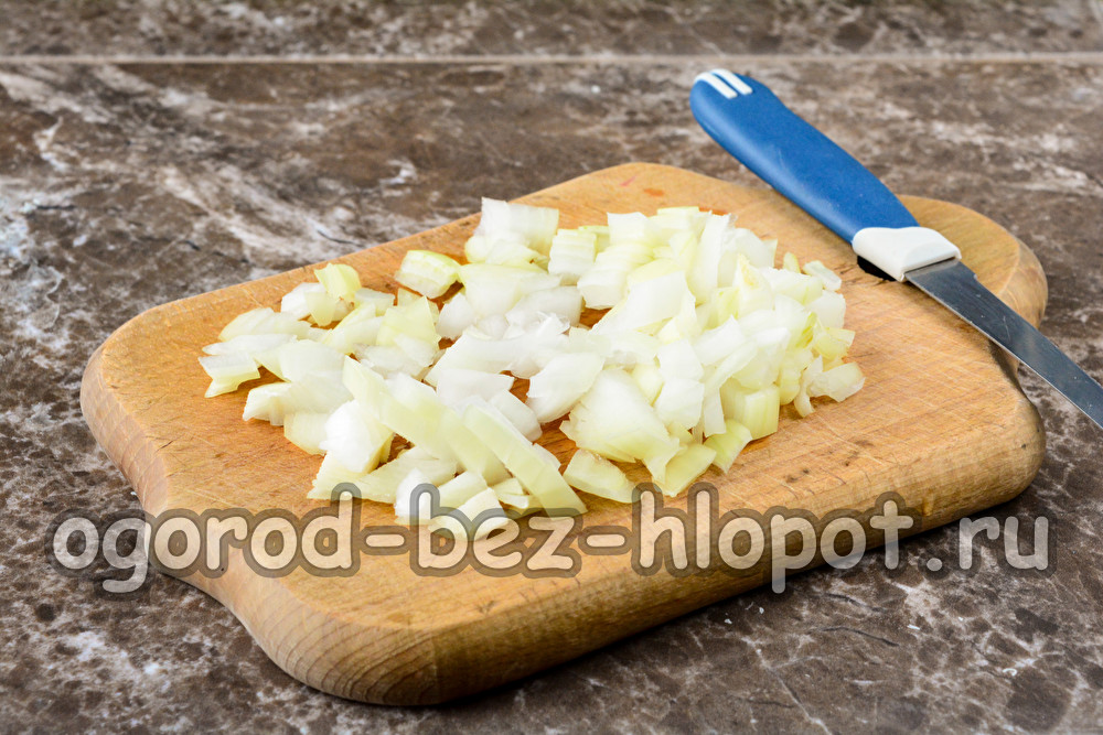 Svogūnus nulupkite ir nuplaukite vandeniu. Susmulkinkite daržovę į mažus kubelius.