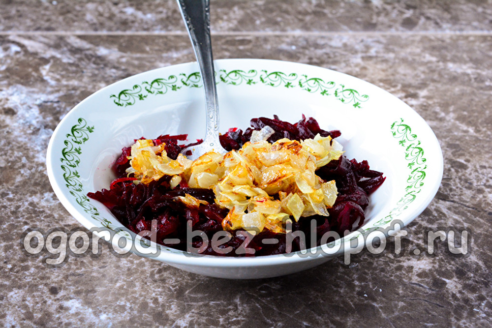 Į burokėlius sudėkite pakepintus svogūnus. Įpilkite svogūną su likusiu aliejumi iš keptuvės. Salotose aliejaus nebereikia.