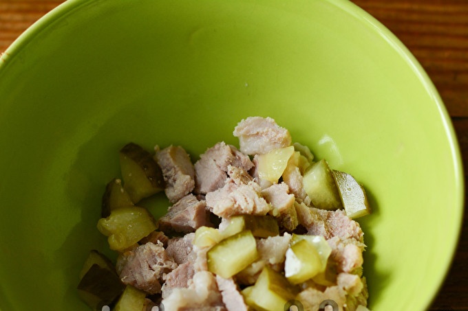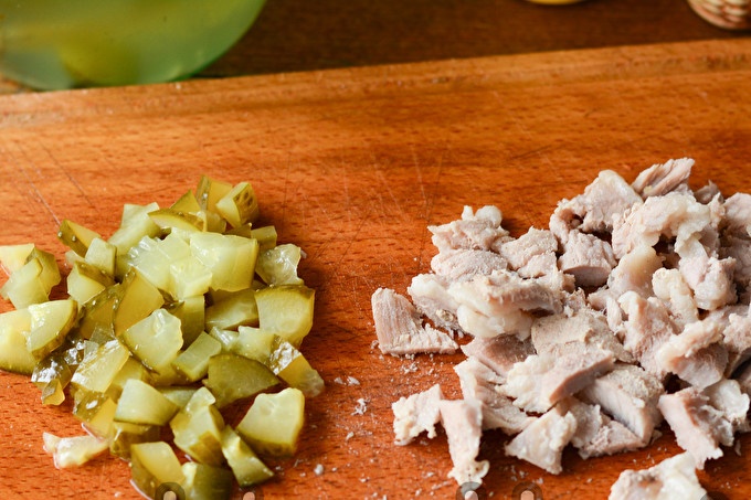 Pirmiausia agurkus supjaustykite išilginėmis plokštelėmis, tada mažais kubeliais. Virkite liesą kiaulieną ar jautieną su prieskoniais. Tada išimkite iš sultinio ir palikite atvėsti. Supjaustykite mažais gabalėliais.