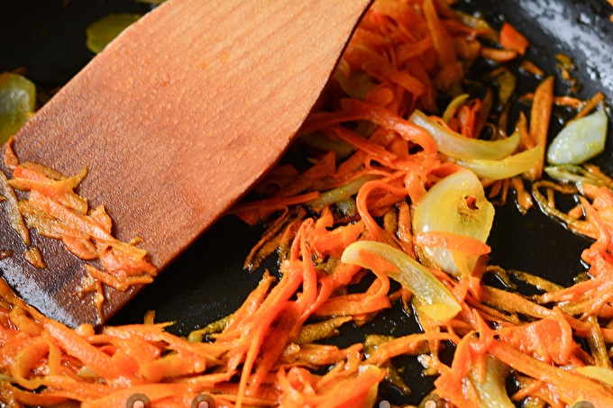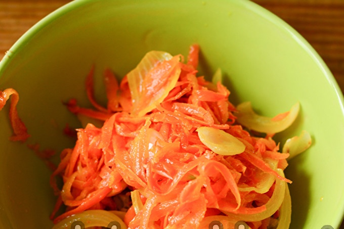 Įkaitinkite aliejų ir sudėkite svogūno griežinėlius. Maišykite ant vidutinės ugnies 2–3 minutes, retkarčiais pamaišydami. Kai tik svogūnas pakeis spalvą, įpilkite į jį kapotų morkų. Sumaišykite komponentus ir uždenkite. Troškinkite dar tris minutes žemoje temperatūroje, kol daržovės suminkštės. Tada sudėti į lėkštę atvėsti.