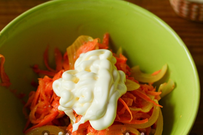 Svogūnus ir morkas reikia tik šiek tiek troškinti, kol suminkštės, kad nepažeistų salotų skonio. Naminis majonezas užkandžiui suteikia nepakartojamo skonio. Pirkdami degalų papildymą prekybos centre, geriau rinkitės pakuotes, kuriose yra didelis riebalų procentas, o skoniai yra mažiausi. Patiekdami patiekalą, būtinai pridėkite smulkiai pjaustytų žalumynų.