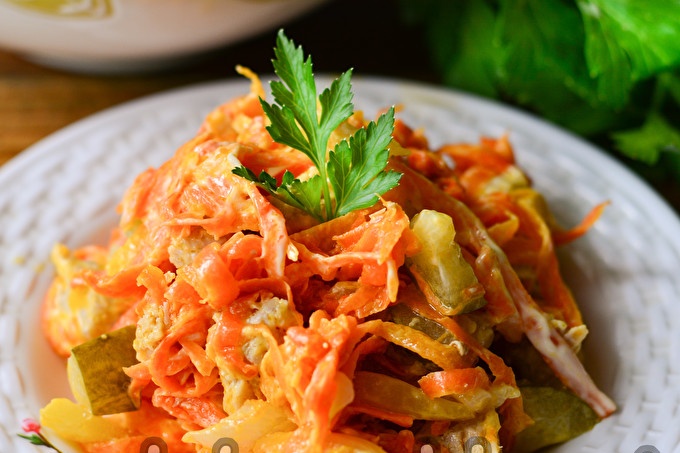 Skanios salotos „Obzhorka“ su mėsa ir marinuotais agurkais