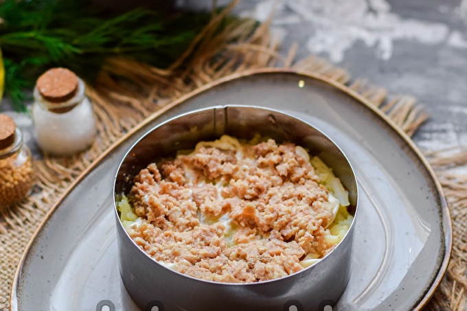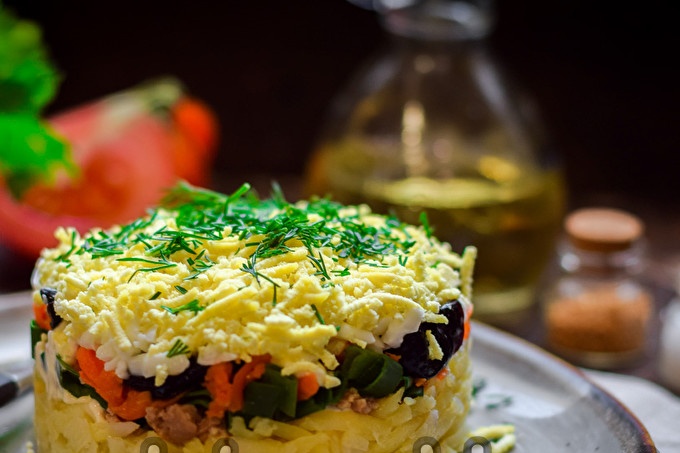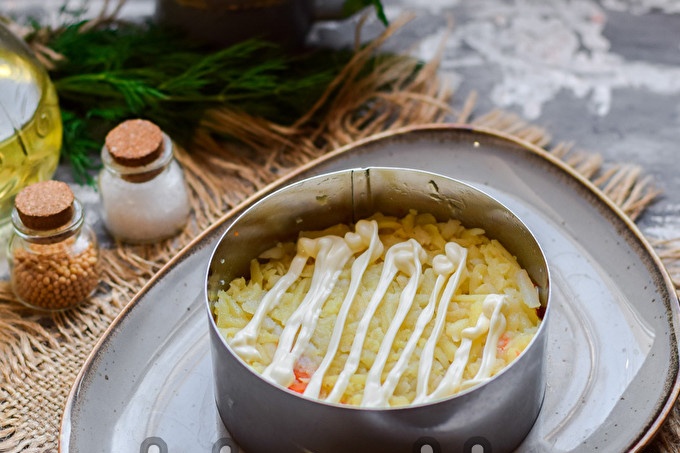 Paruoškite visus sąraše esančius produktus. Bulves užvirkite ir nulupkite, sutarkuokite vidutinėmis drožlėmis, pirmąjį sluoksnį sudėkite į salotas. Visuose salotų sluoksniuose galite druską, pipirus ir sutepti majonezu.