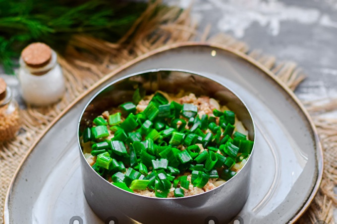 Kaip pasigaminti salotas "Menkių kepenėlės po kailiu"