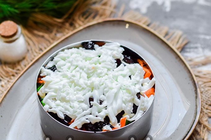 Slyvas nuplaukite ir nusausinkite. Po džiovintos slyvos supjaustykite mažais gabalėliais, ant viršaus uždėkite morkas.