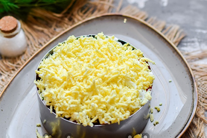 Paskutinis sluoksnis yra vištienos tryniai, tarkuoti ant smulkiausios trintuvės. Valandą pamirkykite salotas ir patiekite.