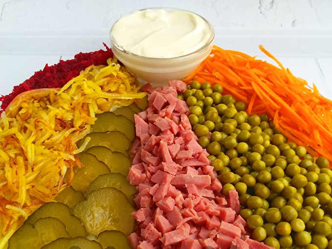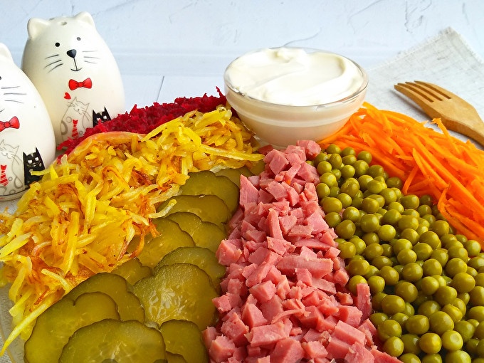 Salotos yra labai elegantiškos, ryškios ir tinkamos šventiniam stalui. Virimas neužima daug laiko.