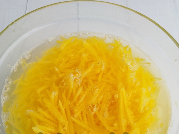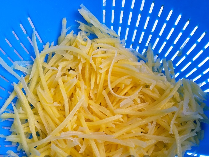 Mirkykite bulves šaltame vandenyje, kad 20 minučių pašalintumėte krakmolo perteklių.