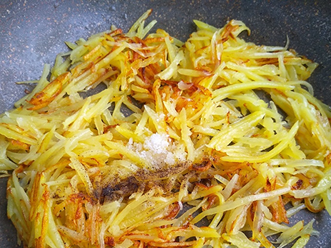 Nuplautas bulves nuplaukite tekančiu vandeniu ir nusausinkite ant popierinio rankšluosčio.