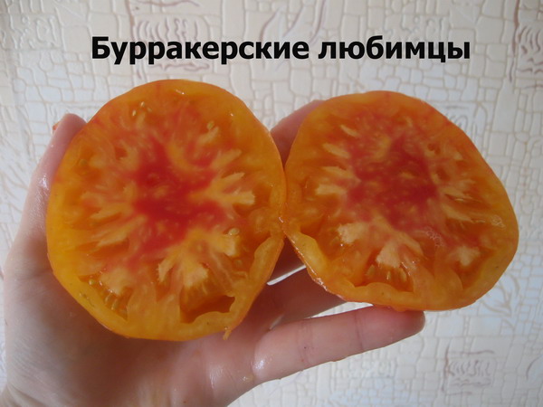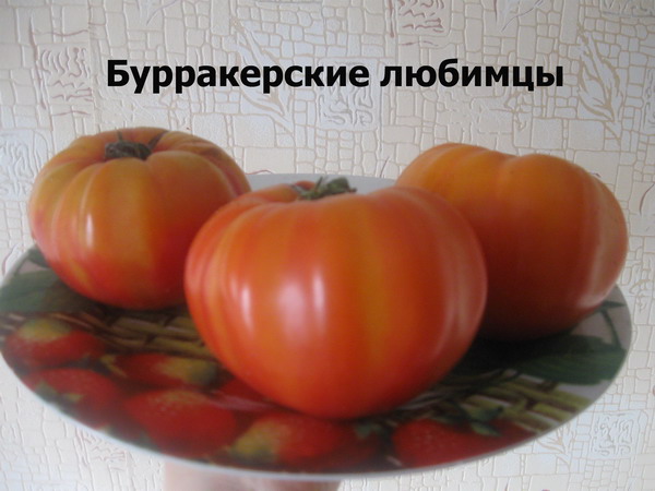 „Burrakerio mėgstamiausi“ yra vienas iš nuolatinių pomidorų mano sode. Pomidorai turi puikų skonį ir gerą derlių. Vaisiai yra geltonai raudoni, spalvoti, gražūs, mėsingi, mažai sėklų. Saldus, bet mes juos skynėme neprinokusius, manau, kad subrendę (tai buvo ant krūmo) skonis dar labiau išliejo.