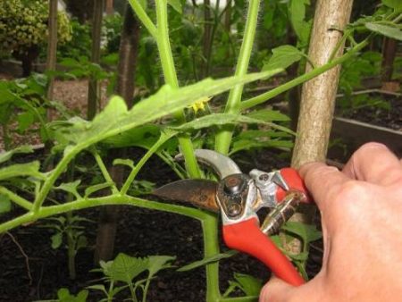 - Visų stiebų viršūnių prispaudimas padės paspartinti suformuotų vaisių nokinimą. Tai padarykite likus maždaug 50 dienų iki galutinio derliaus nuėmimo. Tada palaipsniui sumažinkite laistymą ir padidinkite kalio trąšų dozę. Rugsėjo viduryje krūmai pašalinami iš grotelių ir išdėstomi ant žemės.
