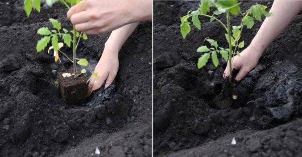 Augalai dedami į paruoštus šulinius su žeme sodinukams. Svarbu tai padaryti, kad nepažeistumėte šaknų sistemos. Po to dirva iš puodelių apibarstoma aplinkine dirva, kad būtų kuo geriau išsaugotos maistinės medžiagos šalia augalo.