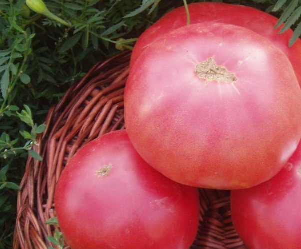 Mėsingi pomidorai, dideli, prinokę - avietės su purpuriniu atspalviu. Vidutinis svoris - 300–500 gramų, vaisiai, laikantis tam tikros žemės ūkio praktikos, užauga iki 800–1000 gramų. Pomidorų forma yra apvali, šiek tiek plokščia, su briaunomis stiebo srityje. Odelė plona, bet tanki, minkštimas labai sultingas, saldus, su nedaug sėklų.