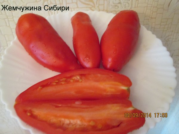 Išoriškai Sibiro veislės perlas pomidorai yra patrauklūs, ryškiai raudoni išsiskiria iš daugelio kitų. Vaisiaus forma yra pailga. Vieno pomidoro masė yra ne daugiau kaip 100–150 gramų. Skyriuje galite pamatyti keletą negilių kamerų su dideliu sėklinės medžiagos kiekiu. Minkštimas pasižymi didele mėsingumu ir sultingumu, turi malonų aromatą. Dėl šilkiniai plonos odos vaisiaus paviršius yra idealiai minkštas liesti.