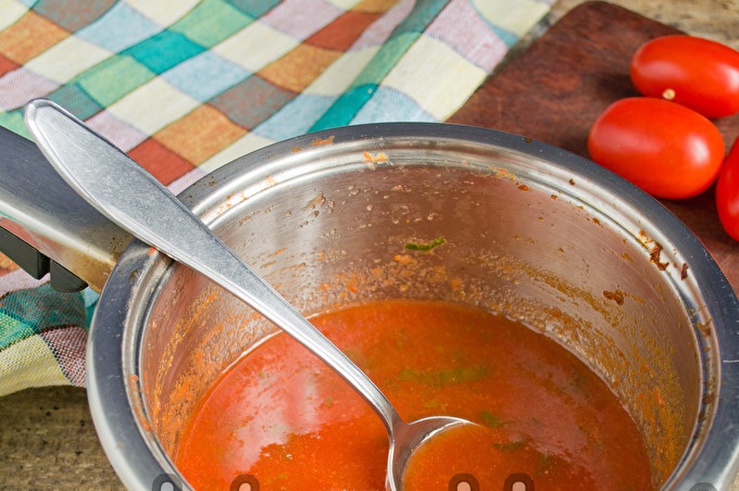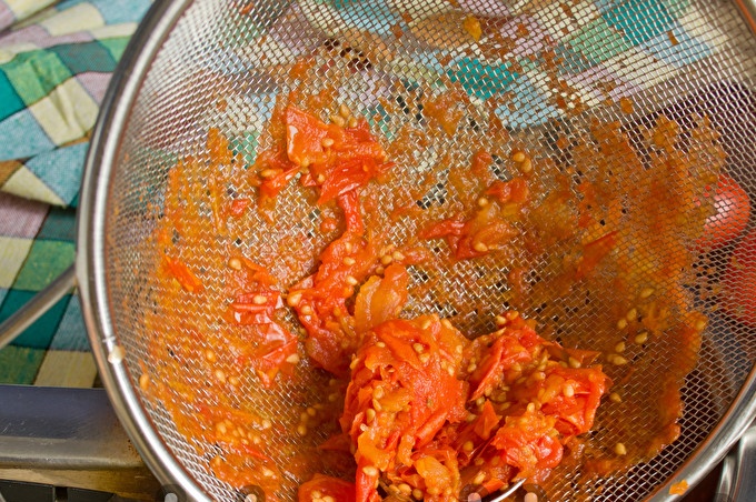 Kitas, mes nuvalome virtus pomidorus per smulkų sietą - mums nereikia žievelės gabalėlių ir pomidorų sėklų.
