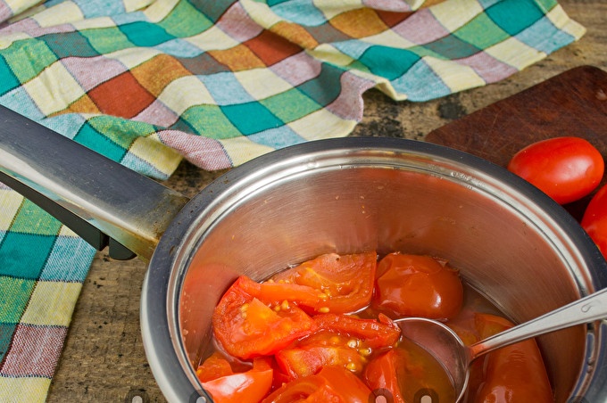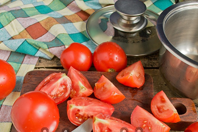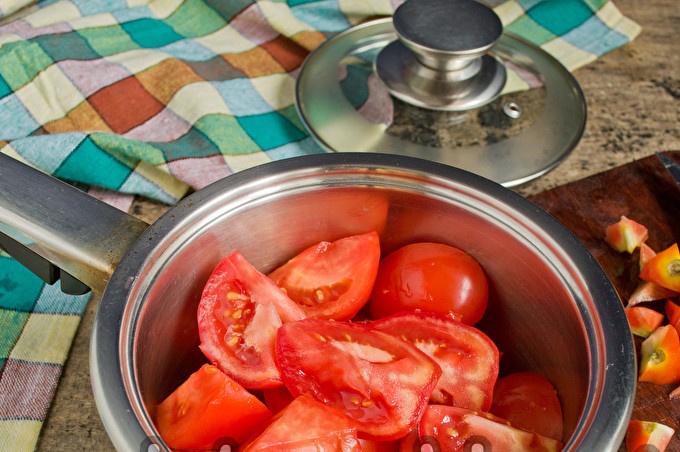 Sudėkite pjaustytus pomidorus į gilų troškintuvą storu dugnu. Beje, ruonius prie stiebelių geriau nupjauti, jei kepate iš įsigytų pomidorų.
