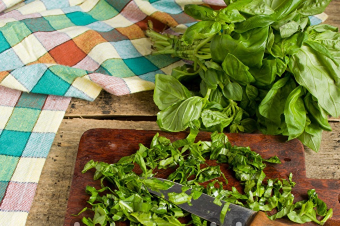 Iš kietų stiebų nupjaustėme žalius baziliko lapus. Mes įdėjome lapus į krūvą, paverskite juos ritiniu. Tada smulkiai supjaustykite lapų ritinį - tai yra labai patogus būdas pjaustyti baziliką, kurį rekomenduoja italai.