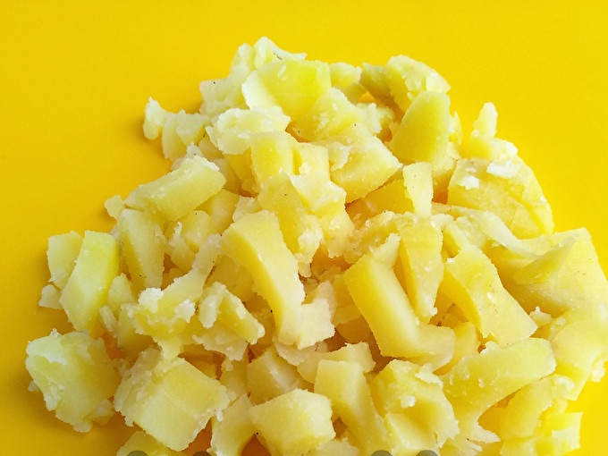 Bulves išvirkite, nulupkite. Supjaustykite, naudodami tinklelį, kad supjaustytumėte daržoves.