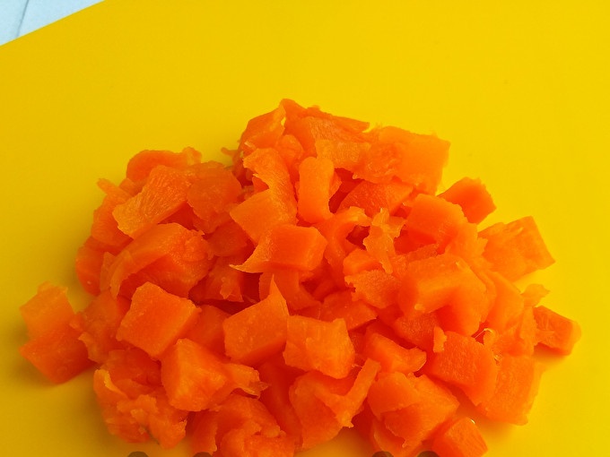 Tokiu pat būdu supjaustykite virtas, nuluptas morkas.