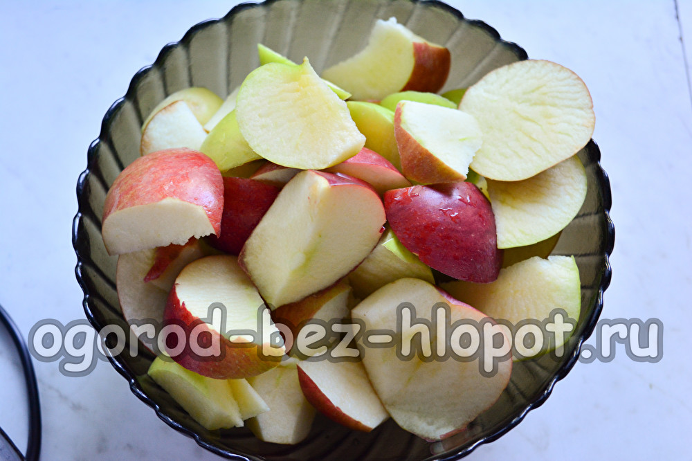 Supjaustykite obuolius į ketvirčius ir supjaustykite šerdį sėklomis, pažeistais segmentais. Jei vaisiai yra nukritę nuo medžio ir neturi slieko, galite pjaustyti patogiomis skiltelėmis, o ne nuimti vidurį. Pasitelkus specialų įrenginį viskas vyks daug greičiau.